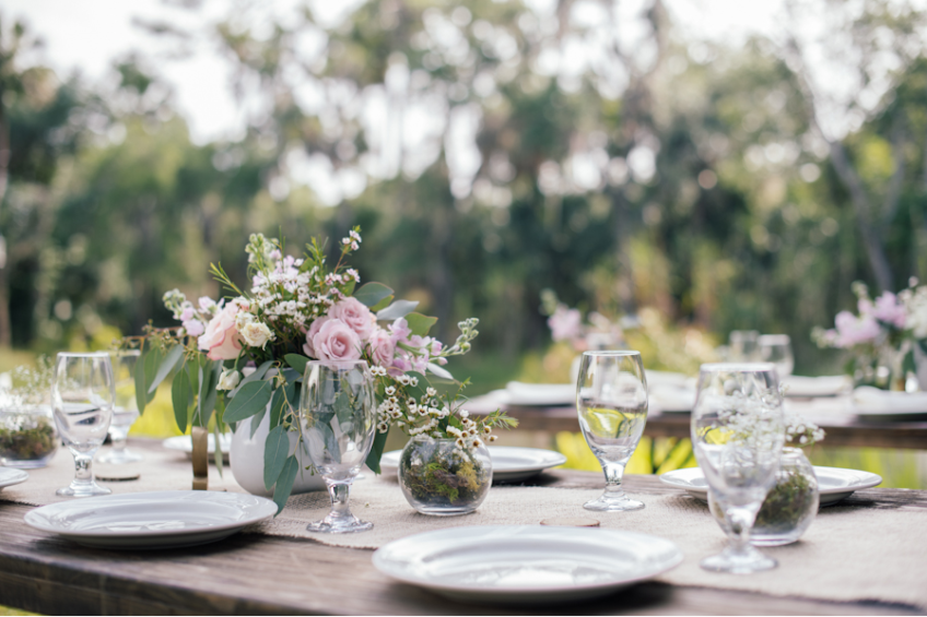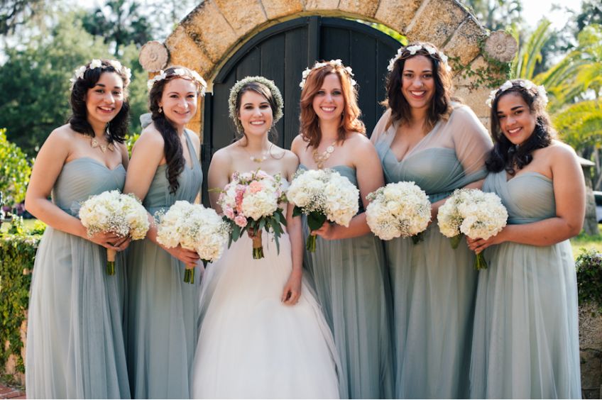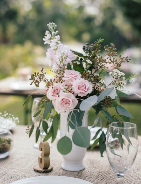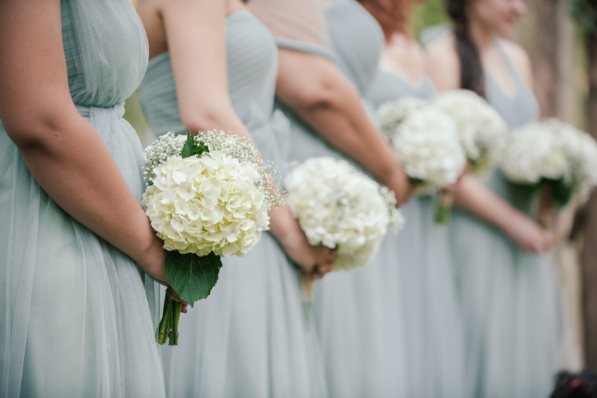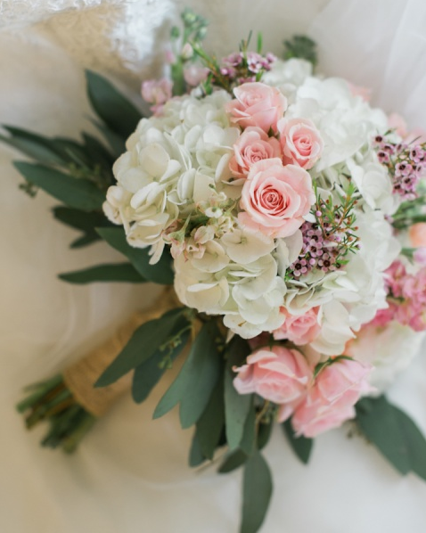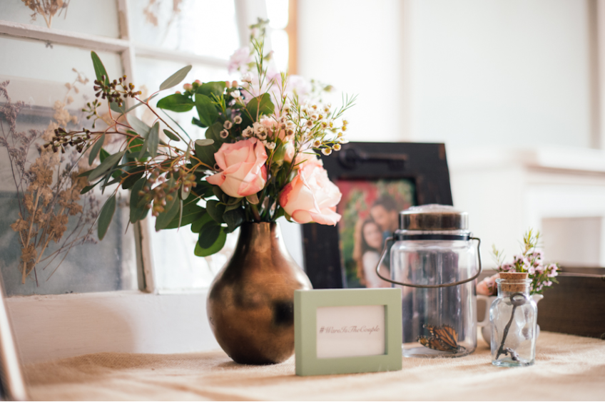 Nikki looked like a princess on her wedding day! She wore a flower crown and carried a bouquet of spray roses and hydrangea. Mismatched pieces of white china were the reception centerpieces. The whole event was sweet, airy, and beautiful!